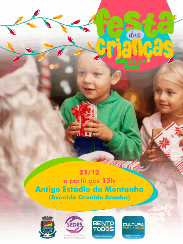 No dia 21 de dezembro, domingo, o município de Bento Gonçalves realiza a Festa de Natal das Crianças. O evento, totalmente gratuito, acontece no antigo Estádio da Montanha, na Avenida Osvaldo Aranha, a partir das 15h. A programação inclui brinquedos infláveis, pintura de rosto, lanche, presença do Papai Noel e diversas atividades recreativas.