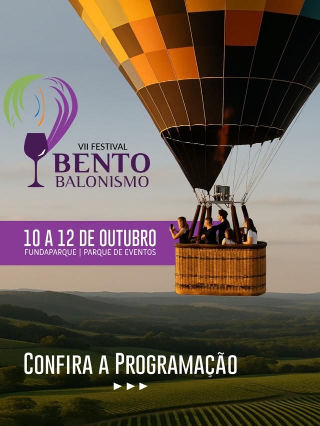 A 7ª edição do Bento Balonismo acontece no próximo fim de semana em Bento Gonçalves. De 10 a 12 de outubro, o céu da cidade ganha o colorido do Festival. O evento na Fundaparque também celebra o aniversário de 135 anos do Município. Tradicional na cidade, o Festival de balonismo contará, no dia 10 de outubro, com os voos partindo dos bairros da cidade. Serão ações no São Roque, Borgo, São João, Fátima e São Valentin. No mesmo dia, ainda será realizada a tradicional carreata de fogos, Night Glow e shows com Dj. Alex de Assis, Disco Groove e Vitor Henrique e Gabriel.