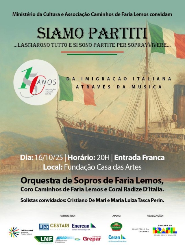 Nesta quinta-feira, dia 16 de outubro, o Anfiteatro Ivo Antônio Da Rold da Fundação Casa das Artes de Bento Gonçalves recebe o espetáculo musical “Siamo partiti”, protagonizado pela Orquestra de Sopros de Faria Lemos, Coro Caminhos de Faria Lemos e Coral Radize D’Italia e conta com a participação especial dos solistas Cristiano De Mari e de Maria Luiza Tasca Perin. A apresentação inicia a partir das 20h e tem entrada gratuita.