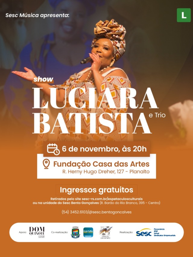 Com uma das vozes negras mais marcantes do RS, Luciara Batista chega à Serra Gaúcha ao lado de seu trio — Cláudio Abreu (violão e voz) e Marquinhos Nunes (percussão) — para um show potente e cheio de identidade e em Bento Gonçalves a apresentação ocorre no dia 06 de novembro, às 20h, na Fundação Casa das Artes, interpretando músicas de grandes nomes da MPB, com foco no samba e suas variações. É samba com elegância e memória afetiva; uma roda moderna, vibrante e arrebatadora.