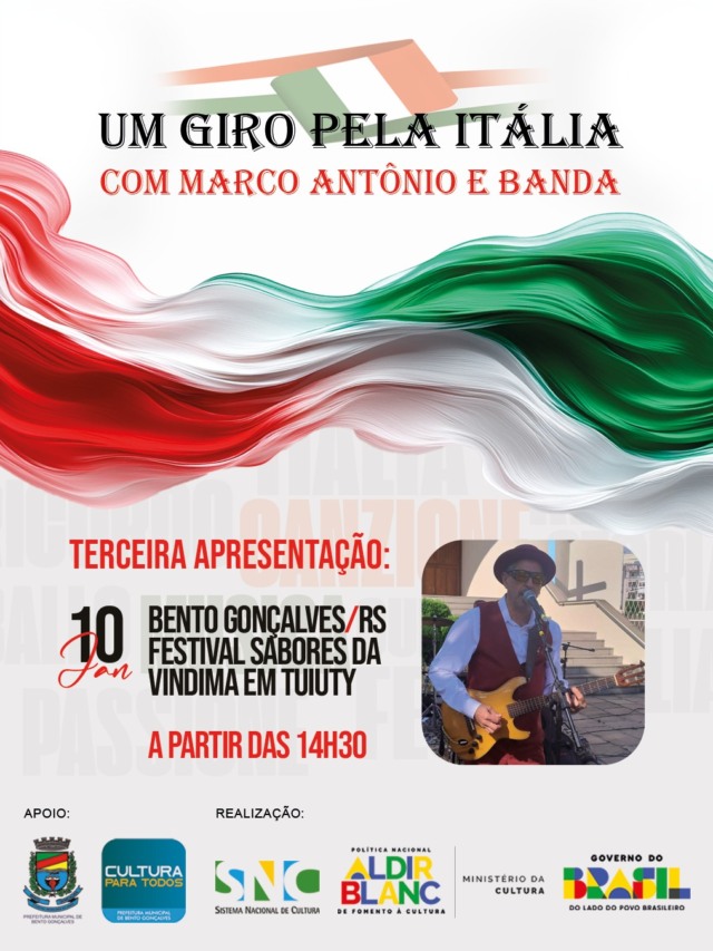O projeto “Um Giro pela Itália com Marco Antônio e Banda”, viabilizado pela Política Nacional Aldir Blanc de Fomento à Cultura por meio do Edital 06/2025 de Bento Gonçalves, segue seu circuito cultural levando música, memória e emoção às comunidades do município. A terceira apresentação acontece no sábado, dia 10 de janeiro de 2026, a partir das 14h30, durante o Festival Sabores da Vindima, no distrito de Tuiuty.