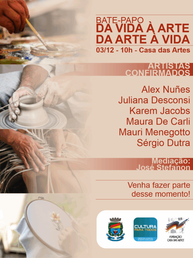 Nesta quarta-feira, dia 03 de dezembro, às 10h, ocorre na Fundação Casa das Artes de Bento Gonçalves, o bate-papo com seis artistas visuais que vão versar sobre seus processos criativos na Arte e suas biografias. Para o encontro foram convidados Maura de Carli, Karem Poletto Jacobs, Juliana Desconsi, Alex Nuñes, Sérgio Dutra e Mauri Menegotto. Na ocasião, vão estar presentes duas turmas, de 1º e 3º ano do Ensino Médio, do Instituo Estadual de Educação Cecília Meireles.