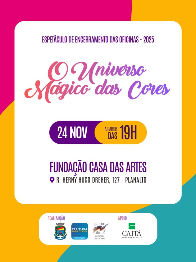 Na próxima segunda-feira, dia 24 de novembro, o Anfiteatro da Casa das Artes de Bento Gonçalves será palco para o tradicional Espetáculo de Encerramento das Oficinas do Programa de Qualificação Artística e Cultural da Secretaria de Cultura, que traz a oportunidade para os alunos, pais e comunidade de apreciar o resultado deste ano de estudo, trabalho e muita diversão.
