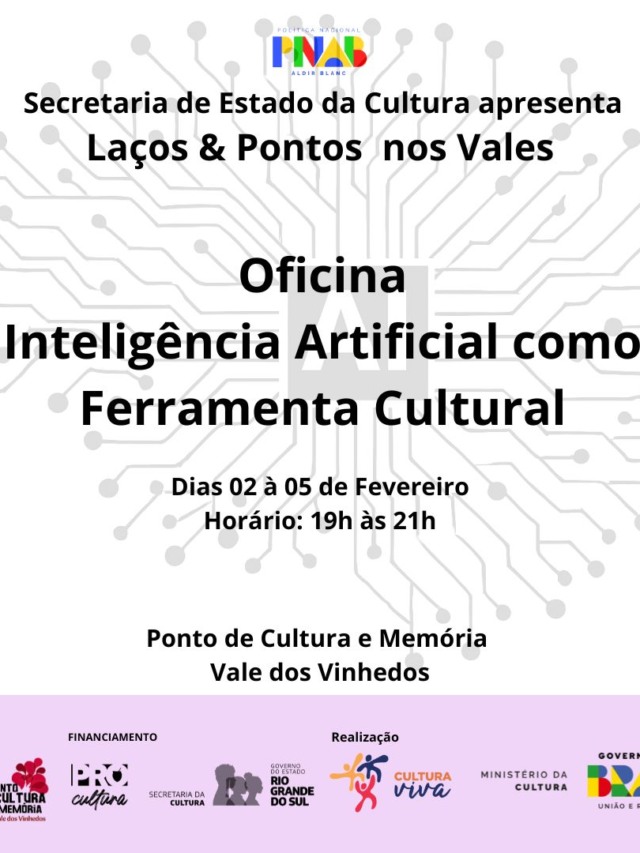 A Oficina “Inteligência Artificial como Ferramenta Cultural” faz parte do projeto cultural “Laços & Pontos nos Vales”, Edital Sedac PNAB, tendo como proponente Circolo Trentino di Bento Gonçalves. Para mais informações e inscrições é preciso entrar em contato por meio deste WhatsApp (54) 99142.7711 ou pelo e-mail [email protected].