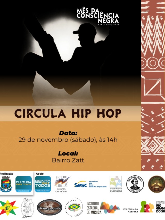Integrando a programação do Mês da Consciência Negra, ocorre neste sábado, dia 29 de novembro, a partir das 14h, no bairro Zatt, o Circula Hip Hop com shows dos b.boys Keno, Leco e Raikiri, expoentes da cena rubana do município.