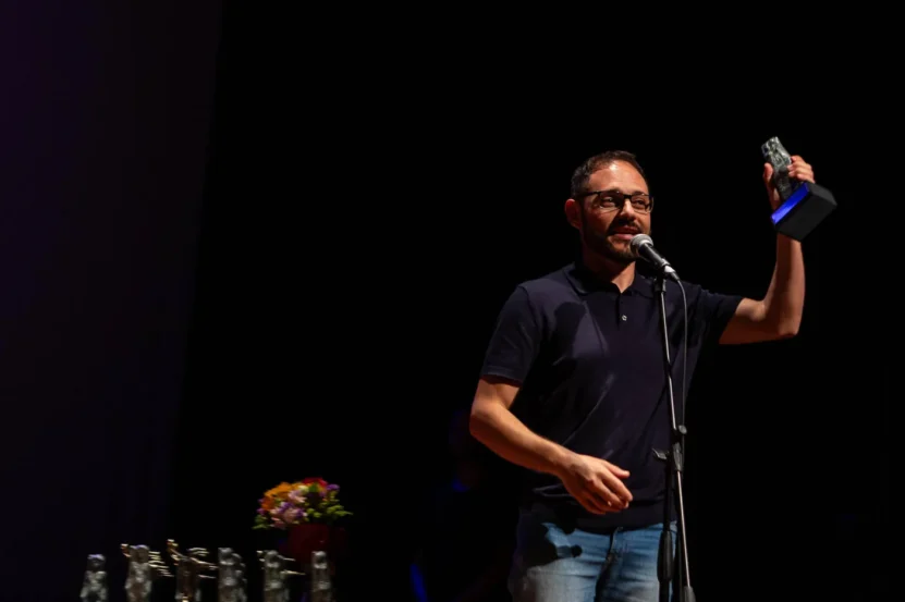 Fábio Cuelli com o troféu de Melhor Ator por sua atuação em Geppetto
