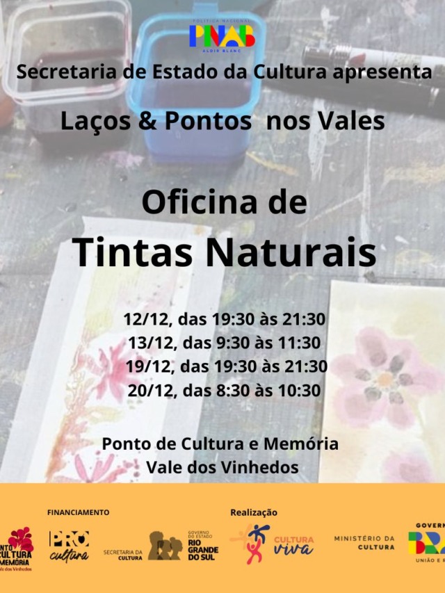 O projeto cultural Laços & Pontos nos Vales promove, a partir do dia 12 de dezembro no Ponto de Cultura e Memória Vale dos Vinhedos, a Oficina de Tintas Naturais, ministrada pela artista visual Sarah Milani. A oficina tem como ementa orientações e práticas sobre como extrair de elementos da natureza como terra, raízes, vegetais, minerais, flores, folhas, carvão, entre outros, cores para a produção de pigmentos para serem utilizados em pinturas plásticas.