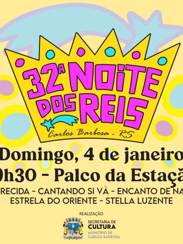 A 32ª Noite dos Reis deve encantar os barbosenses com a apresentação de cinco ternos de reis. O evento está marcado para o próximo domingo, dia o4 de janeiro, a partir das 19h30, no Palco da Estação de Carlos Barbosa.