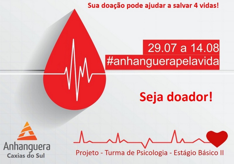 Para incentivar a coleta, os estudantes do curso de Psicologia da Anhanguera de Caxias do Sul lançaram na quarta-feira (29) a campanha Anhanguera pela Vida, que se estende até o dia 14 de agosto. A ação será realizada por meio de redes sociais, com o objetivo de arrecadar 50 bolsas de sangue.