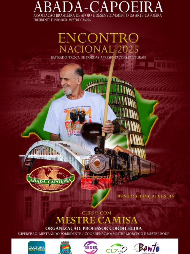 A Associação Brasileira de Apoio e Desenvolvimento da Arte-Capoeira promove em Bento Gonçalves, de 19 a 21 de dezembro, o Encontro Nacional 2025. O evento irá contar com o fundador da Abadá, José Tadeu Carneiro Cardoso, mais conhecido como Mestre Camisa, um dos grandes símbolos deste esporte cultural, considerado Patrimônio Cultural desde 2008 pelo IPHAN, por meio do Ofícios dos Mestres e da Roda, assim como, as práticas e saberes ancestrais, e desde 2014, pela Unesco.