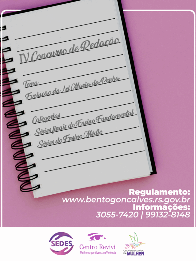 A Coordenadoria da Mulher e Centro Revivi de Bento Gonçalves estão promovendo o IV Concurso de Redação para alunos dos Anos Finais e do Ensino Médio de escolas municipais, estaduais e particulares. Neste ano, o tema é Evolução da Lei Maria da Penha, principal instrumento de enfrentamento e combate às violências de gênero.