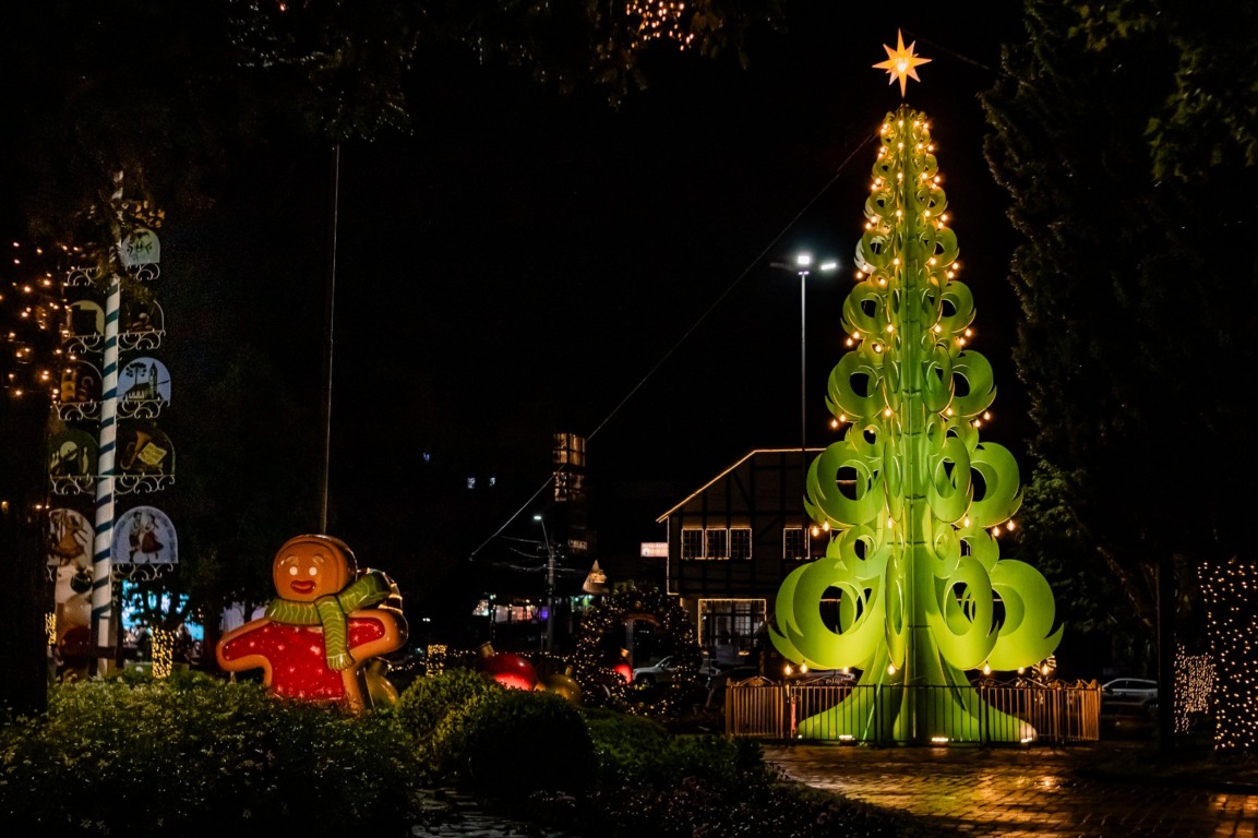 Essa mesma proposta permeia o conceito da Árvore de Natal gigante, com 12 metros de altura, que ornamenta a Praça das Flores e já se consolida como cartão-postal para quem passar pela cidade. Seja durante o dia ou à noite, quando ganha o realce de uma iluminação cênica, a peça de design autoral homenageia souvenires decorativos alemães. O entorno combina outros elementos clássicos natalinos, enriquecidos por registros que mostram lembranças afetivas e valorizam a identidade germânica, com hábitos, tradições e paisagens típicos da região desta colonização.