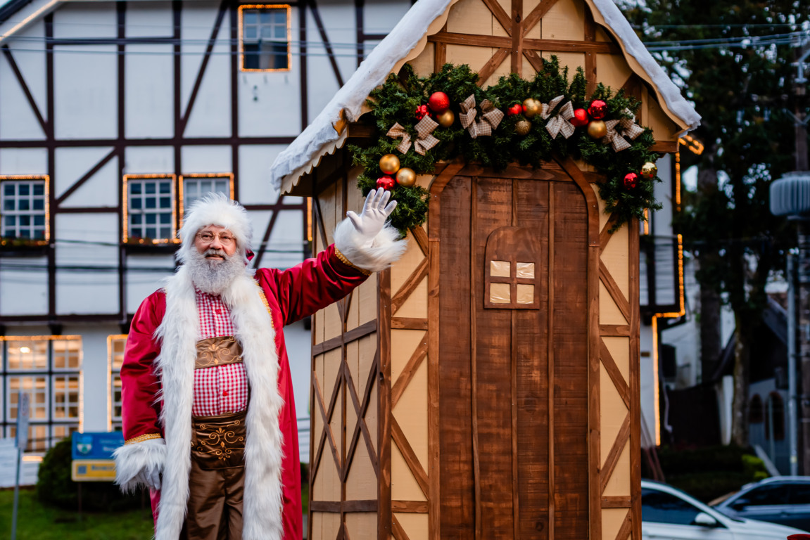 Por lá, por exemplo, o traje vermelho do Papai Noel divide espaço na composição com o Lederhosen, vestimenta típica alemã que traz calça, suspensórios e camisa xadrez. O ‘Bom Velhinho’ que aparece, pessoalmente, em momentos-chave da programação, também exibe uma charmosa releitura dessa composição, com o traje típico apresentado em marrom e xadrez e complementado pelo tradicional manto vermelho.